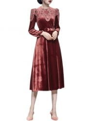 Swing Dress Velvet Lace Patchwork Tie-waist Long Sleeve Maxi Dresses