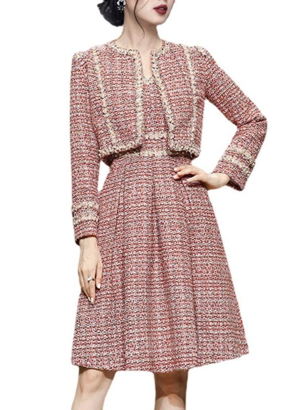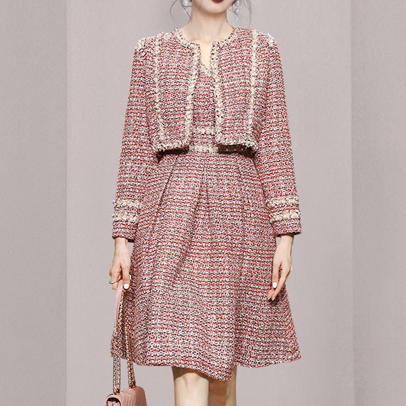 Two Piece Dress Pearl Ribbon Decorative Coat Spaghetti Swing Dress