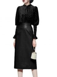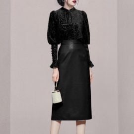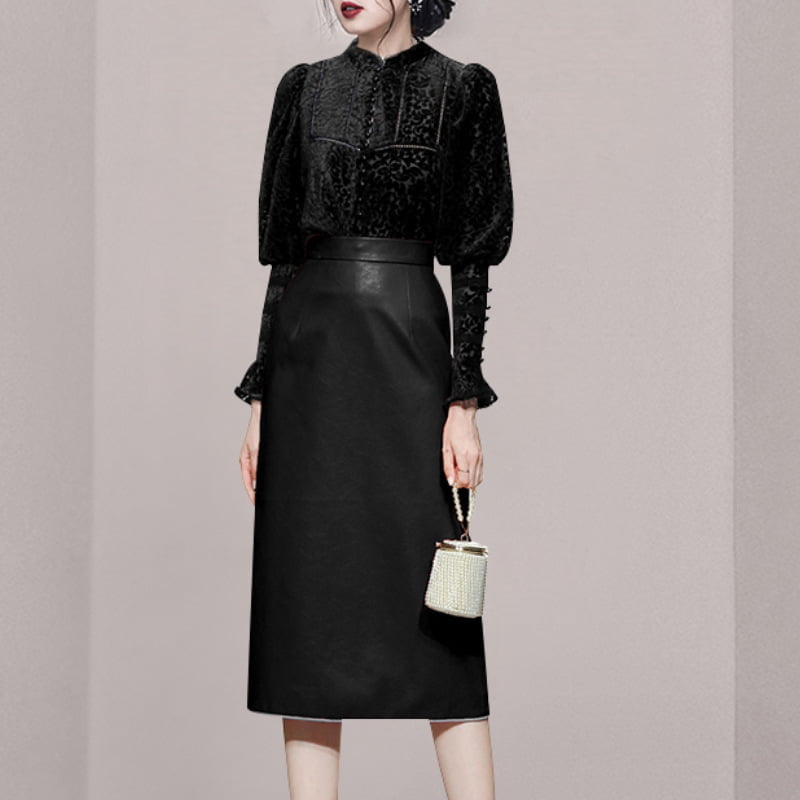 Two Piece Set Lantern Sleeve Velvet Top Leather Skirt Dress Suits