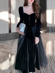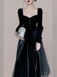 The retro square-neck dress is matched with high-quality velvet material. which is soft. comfortable. and fashionable; The unique mesh stitching design makes this dress lighter;