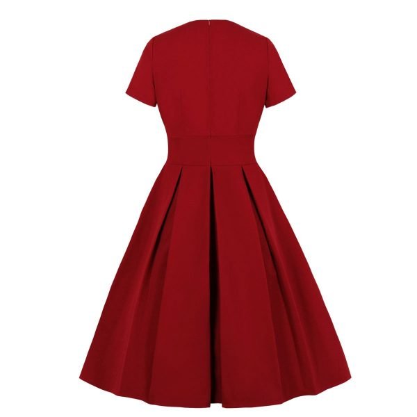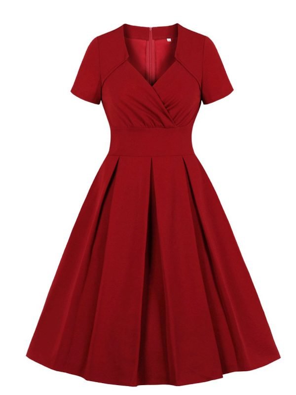 This Women’s Red Dress. of Audrey Hepburn’s Style. Deep V-Neck. Ruffled Front. Tie Waist. A Big Swing Type;