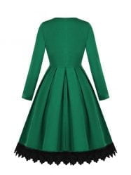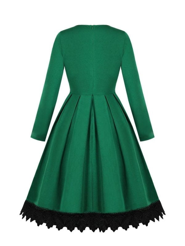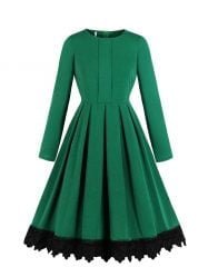 Vintage Dresses Round Neck Lace Stitching Long Sleeve Midi Swing Dress