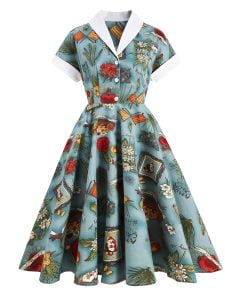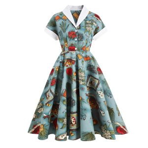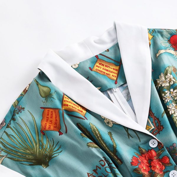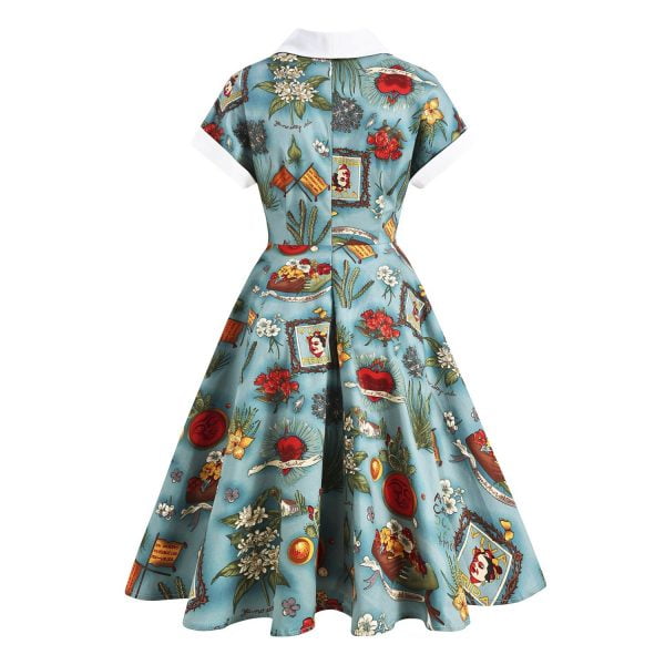 Designs: With Audrey Hepburn’s style. V-Neck. vintage floral color-block pattern. a large swing type. button-down design. this will make you look sexy and cute!