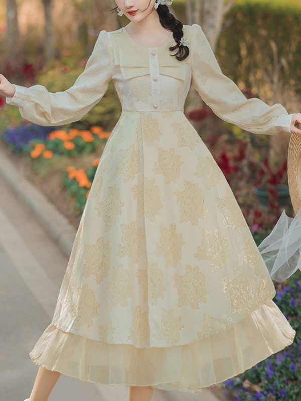 Wedding Guest Dresses Round Neck Lantern Sleeve High Waist Lace Swing Dress