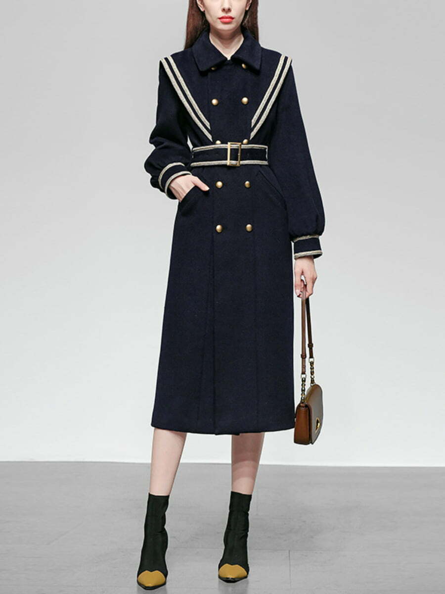 The contrast color edging design makes this solid color coat more fashionable; The navy style design with the lapel and waist is retro and classic; The high-quality fabric is soft and comfortable. can resist the cold wind and keep warm;