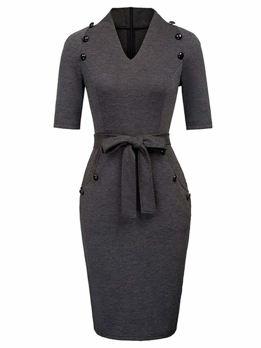 Winter Dress V-neck Three Quarters Sleeve Button Belt Pencil Dresses