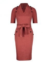Winter Dress V-neck Three Quarters Sleeve Button Belt Pencil Dresses