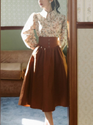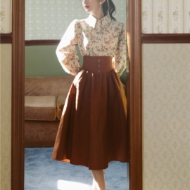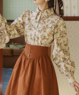 Women Vintage Dress Floral Print Splicing Two Piece Suit Dress