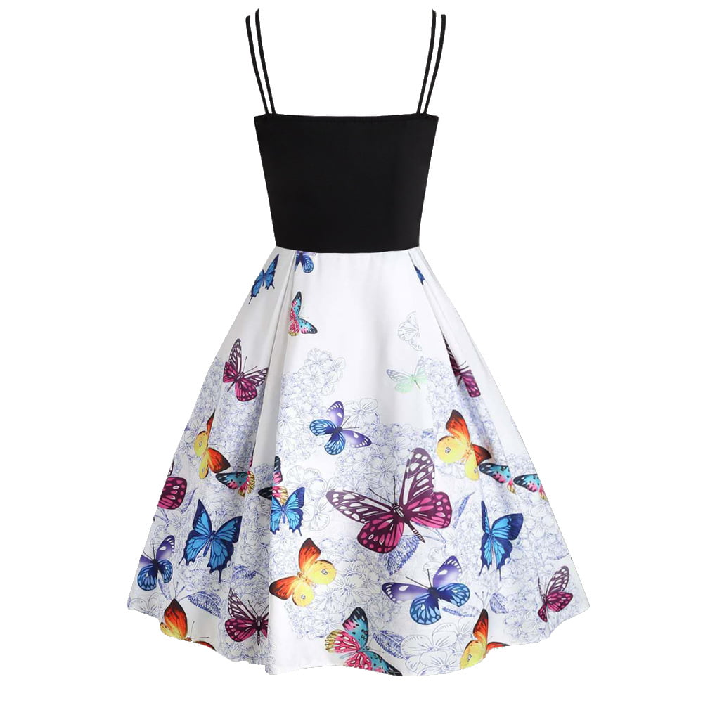 Design: spaghetti strap. Knee Length/Below Knee/midi a-line swing casual dress. A-Line. butterfly design. Swing Vintage Flare Patchwork Contrast party dress. Girdling Button Decoration work dress. hourglass shape. Narrows hips. Elongates torso.