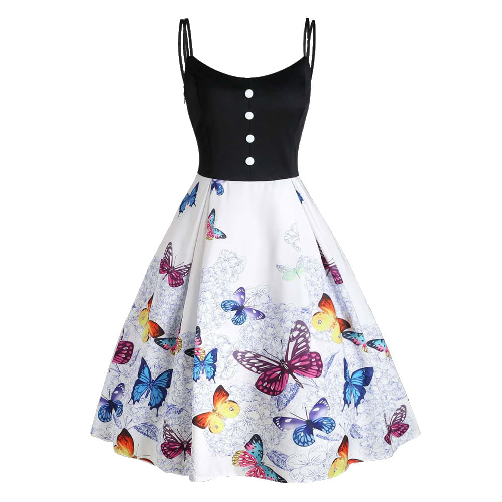 Women’s 1950s Dresses Butterfly Print Button Decor Spaghetti Strap Dresses