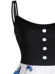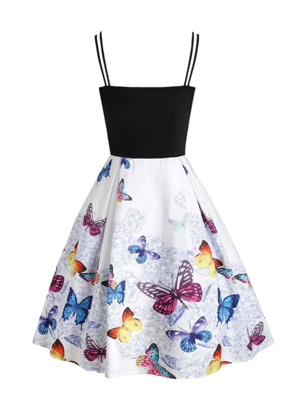 Design: spaghetti strap. Knee Length/Below Knee/midi a-line swing casual dress. A-Line. butterfly design. Swing Vintage Flare Patchwork Contrast party dress. Girdling Button Decoration work dress. hourglass shape. Narrows hips. Elongates torso.