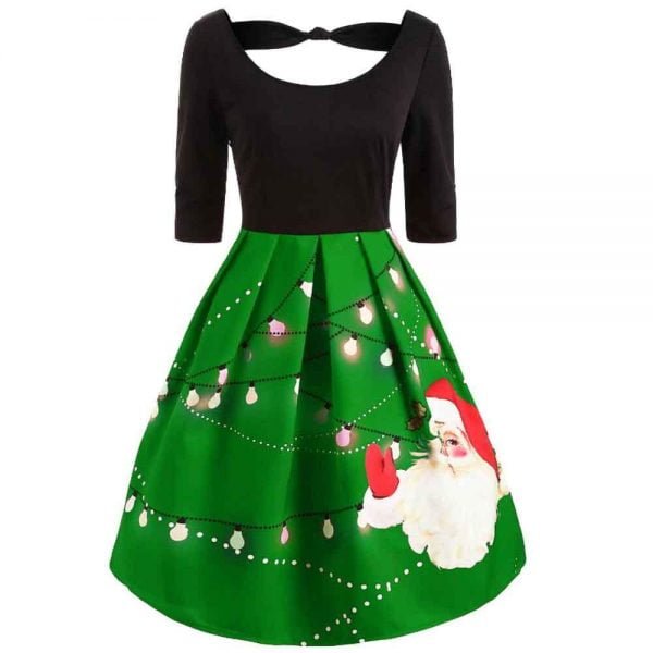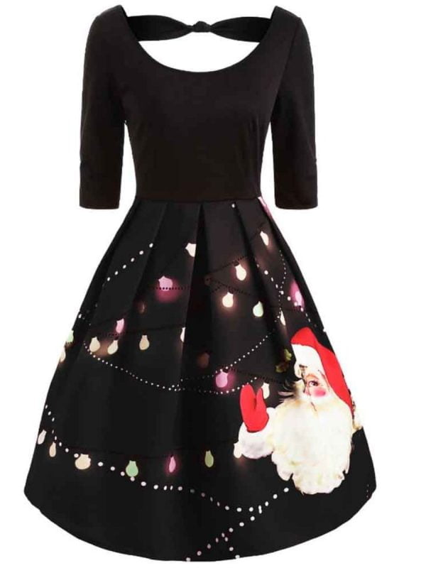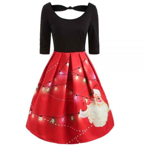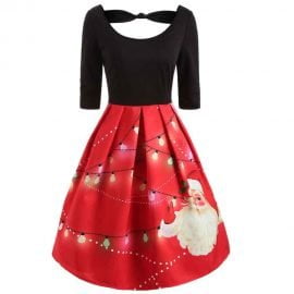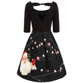 Women’s Christmas Dress Backless Bow Printed Midi Sleeve Swing Dresses