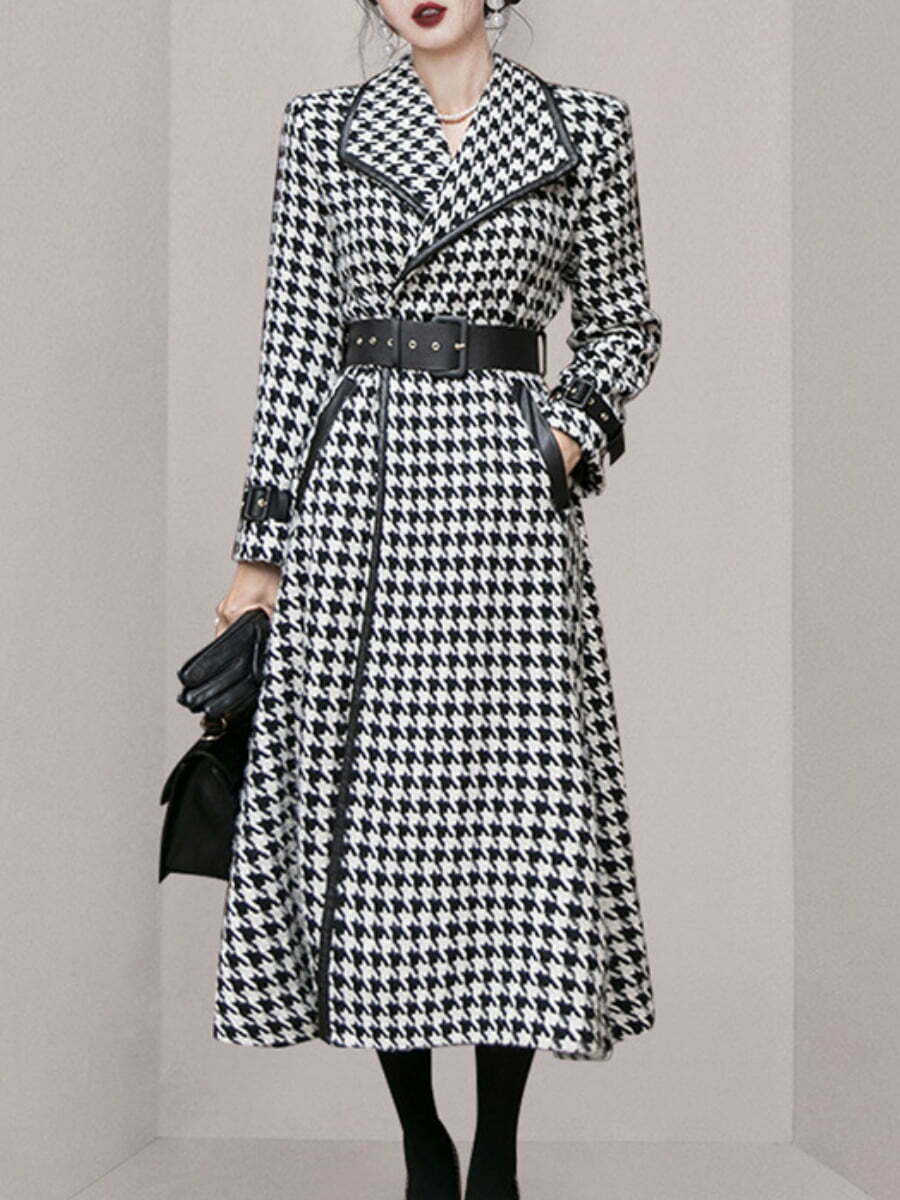 Women’s Coat Houndstooth Cross Lapel Belt Wool Swing Winter Coats