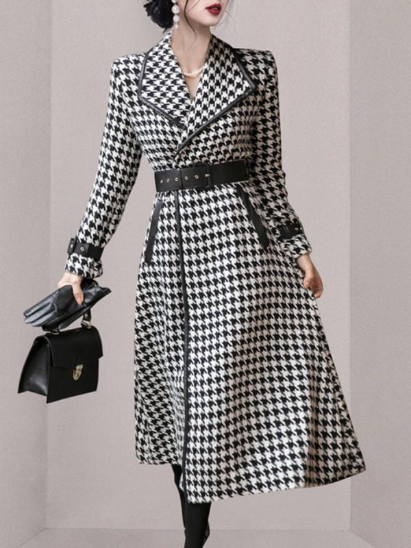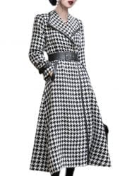Women’s Coat Houndstooth Cross Lapel Belt Wool Swing Winter Coats