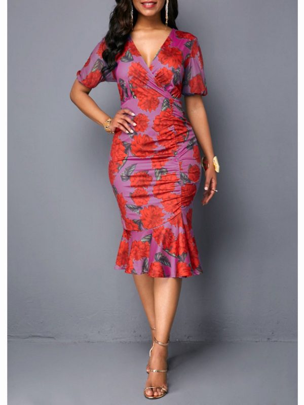 Women’s Dress Cross V-neck Ruffle Plus Size Midi Bodycon Dress