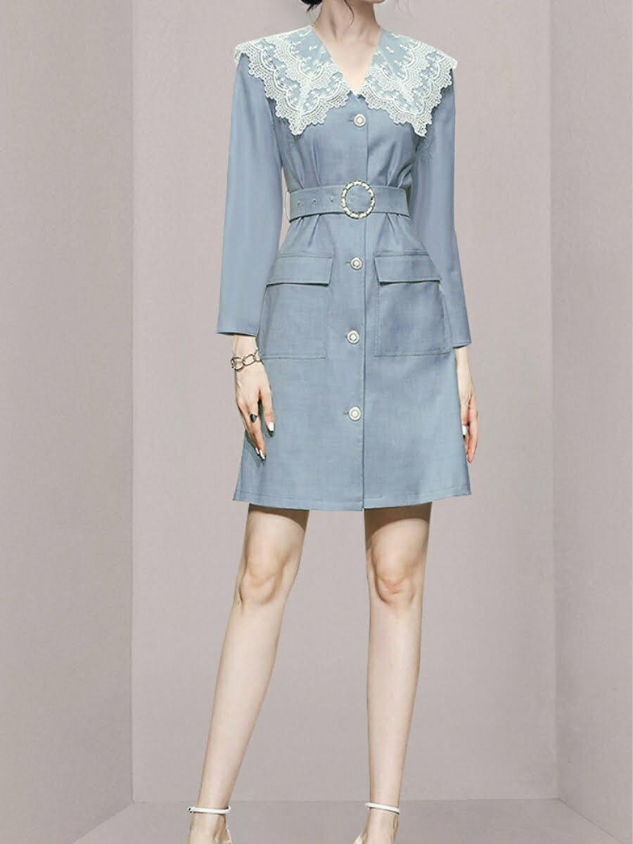 The unique lace lapel design makes this dress fashionable and cute; The combination of the ring design of the belt and the single-breasted design on the dress adds to the retro atmosphere of the dress;