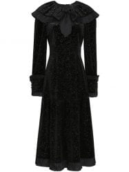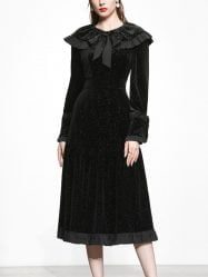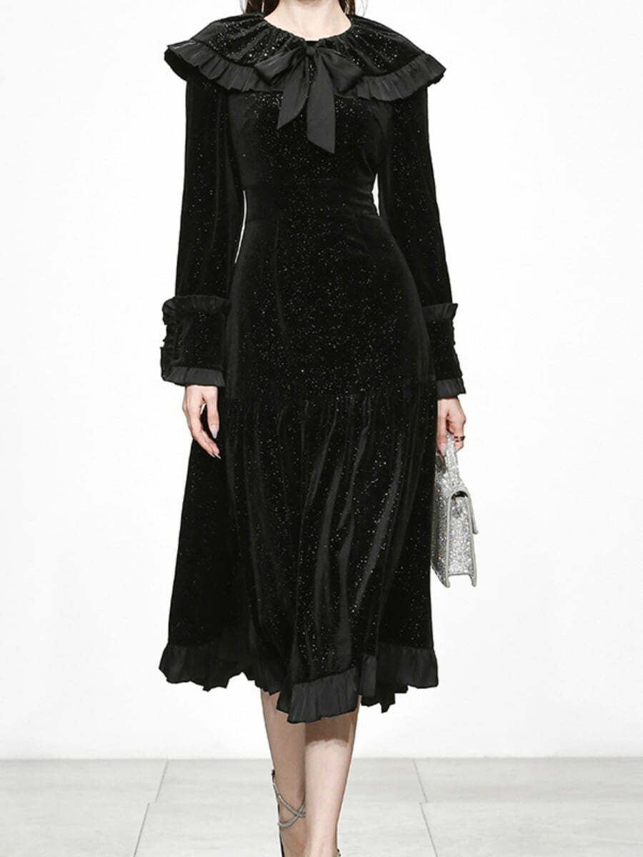 Women’s Dress Lapel Bowknot Shiny Velvet Ruffle Hem Swing Dress