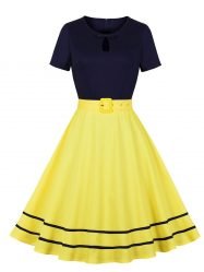 The 1950s Dress. round neck. a hollow-out on the front. blue-yellow color block design. belt on the waist. stripe patchwork. a big swing type;