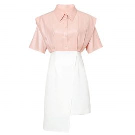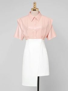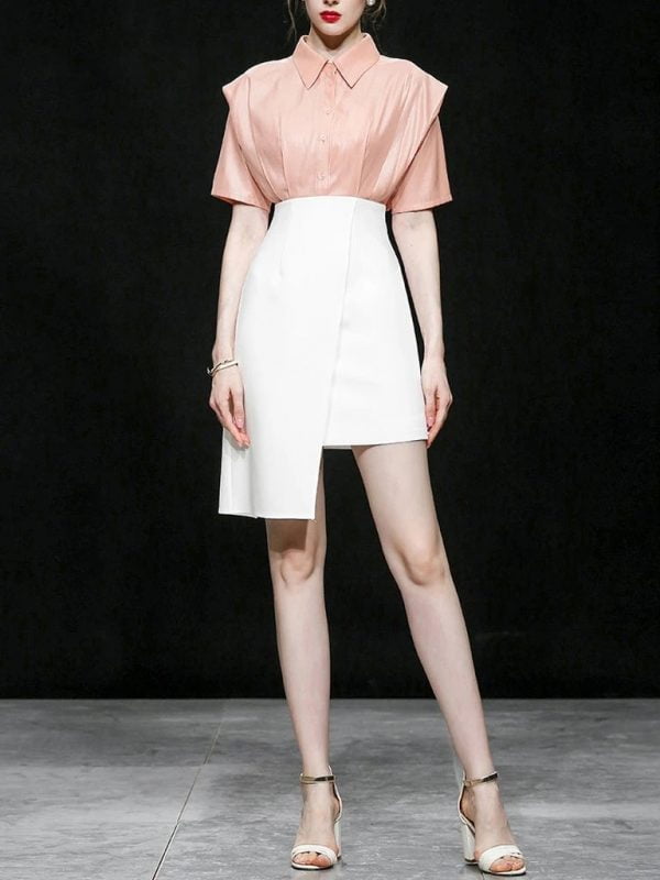 Women’s Dress Two Piece Stitching Turn Down Collar Slim Irregular Dress