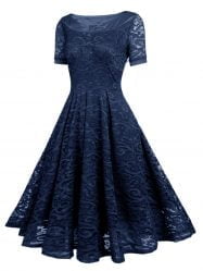 Women’s Dresses Round Neck Short Sleeve Lace Tie-waist Knee Length Swing Dresses
