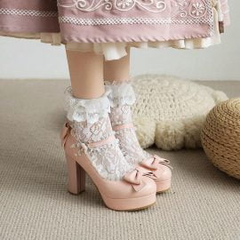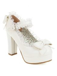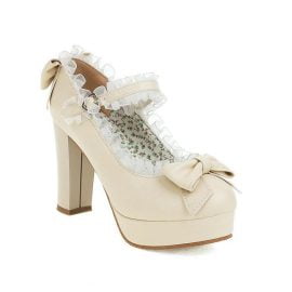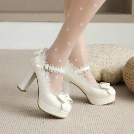 Women’s High Heels Round Toe Bowknot Lace Platform Mary Jane Shoes