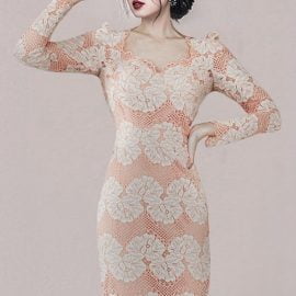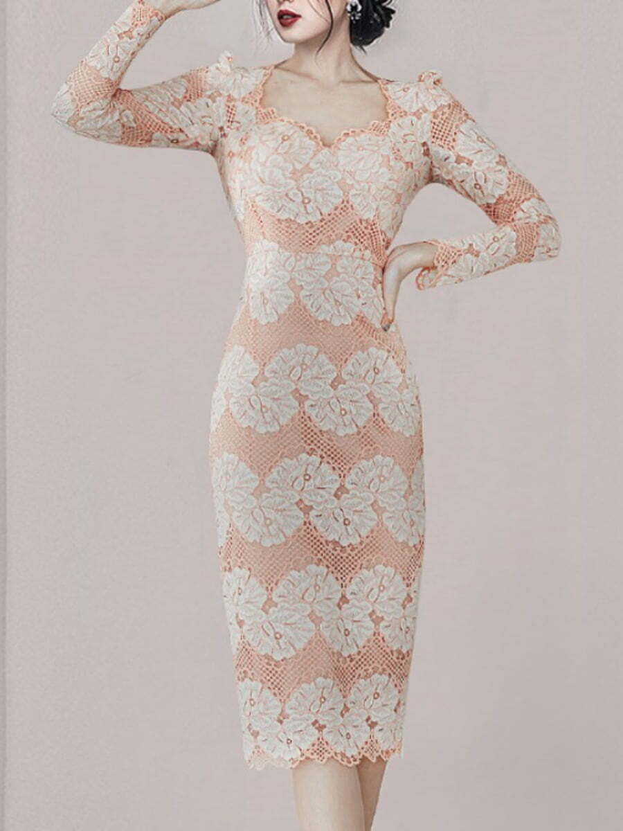 Women’s Lace Dresses V-neck Floral Long Sleeve Midi Bodycon Dresses