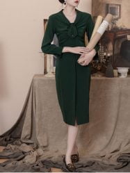 The unique lapel button neckline is like wearing a bow tie. retro and fashionable; This pencil dress has s split on the front. which perfectly shows your body curve without affecting your normal walking;