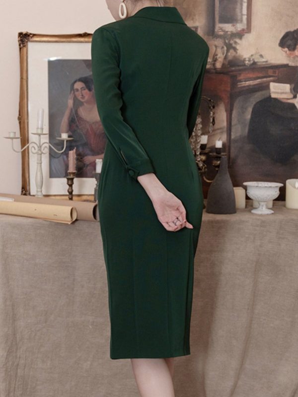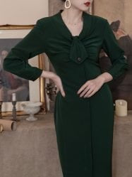 Women’s Pencil Dresses Pleated Button Neck Long Sleeve Split Vintage Dresses