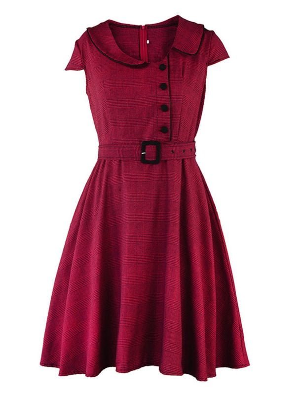 Women’s Plaid Dress Doll Collar Short Sleeve Belt A-line Swing Dress
