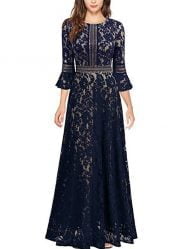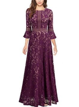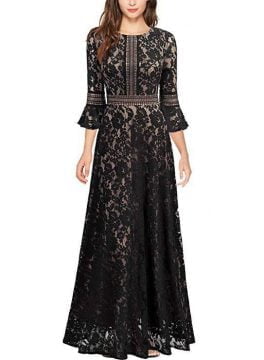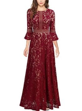 Women’s Prom Dress Round Neck Lace Floral Bell Sleeve Hollow Maxi Dress