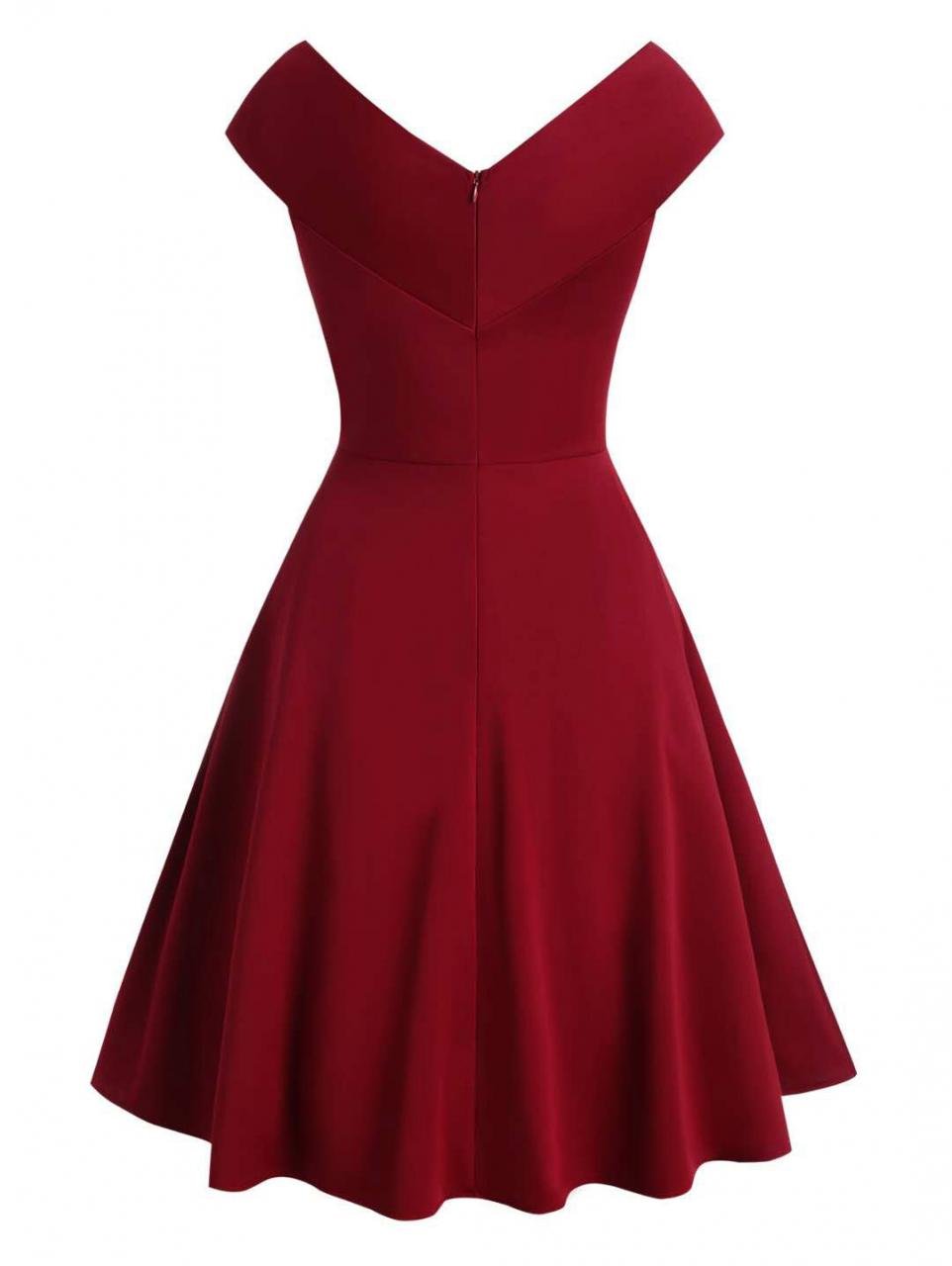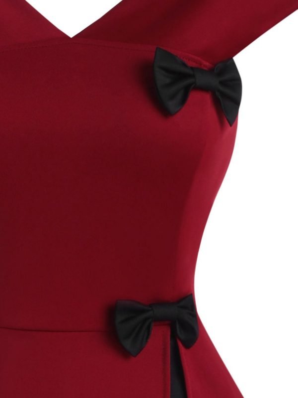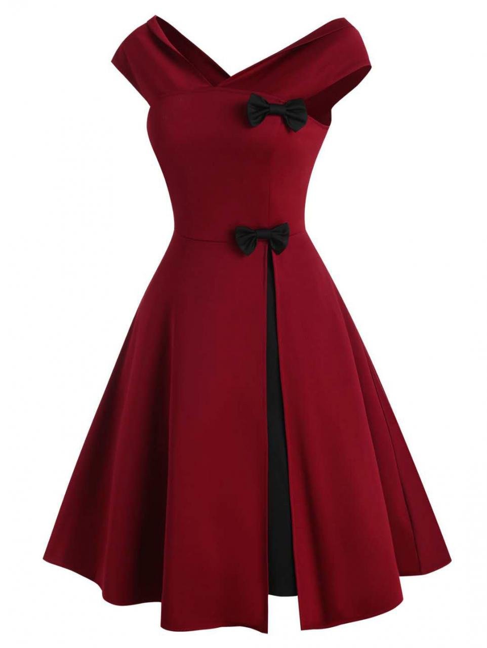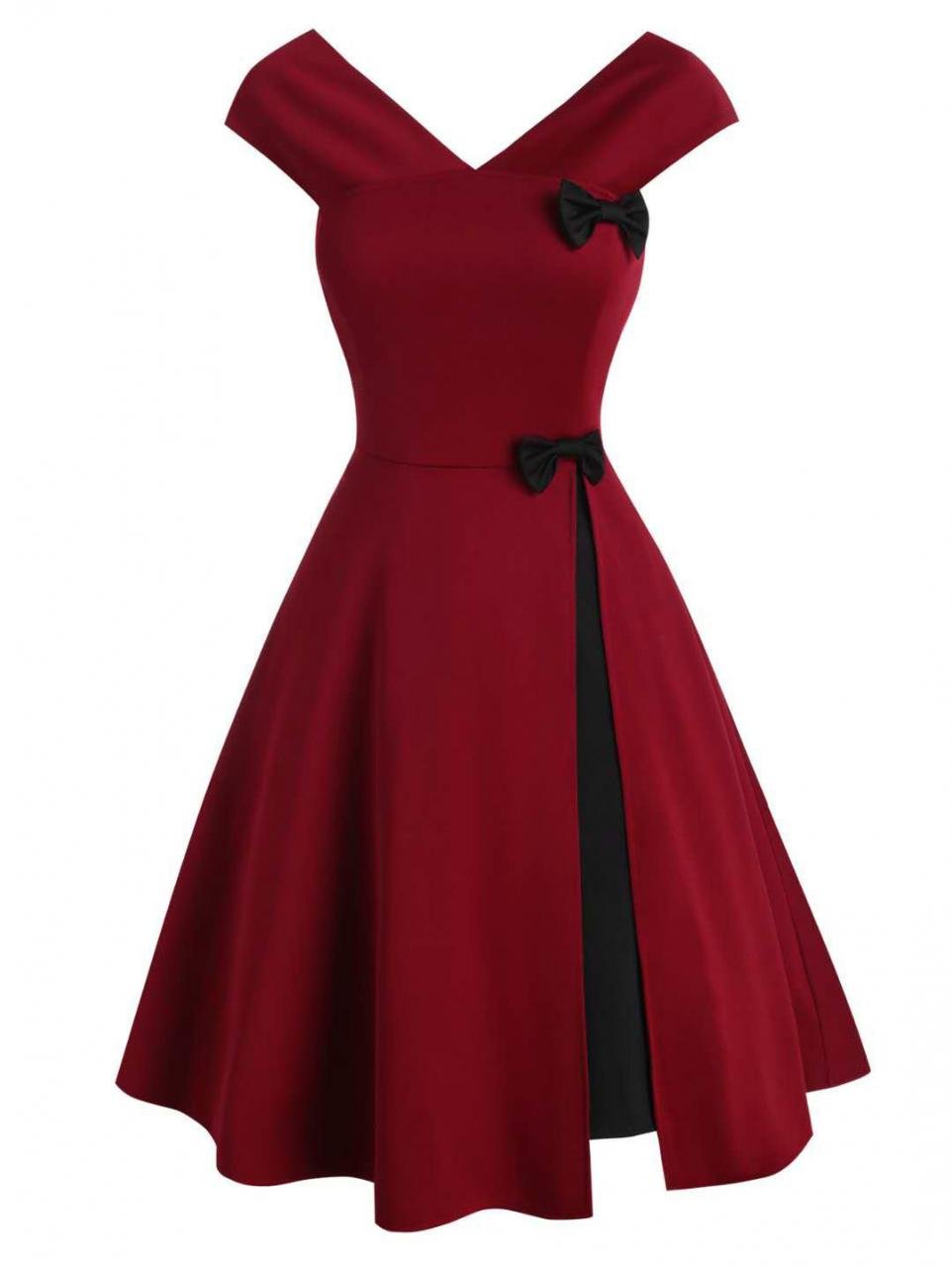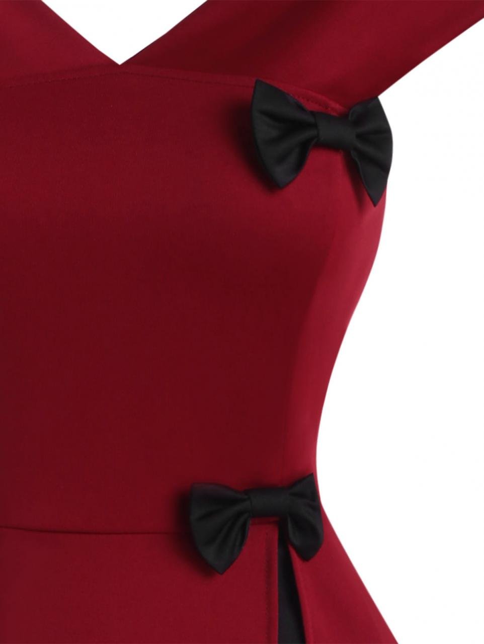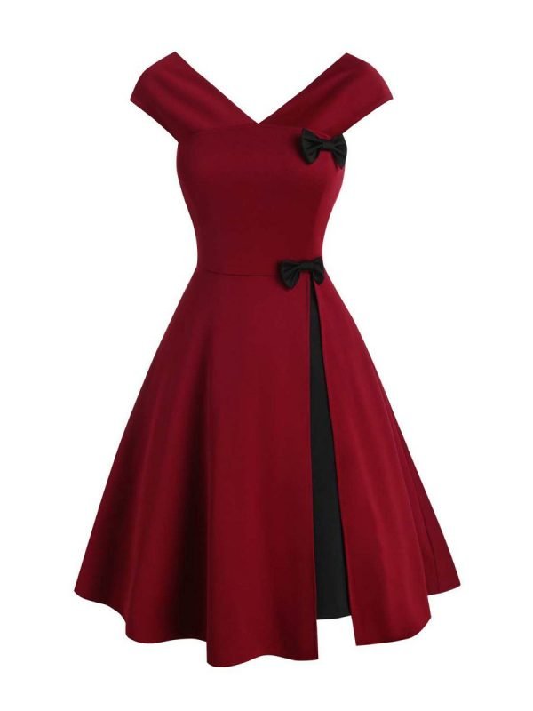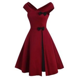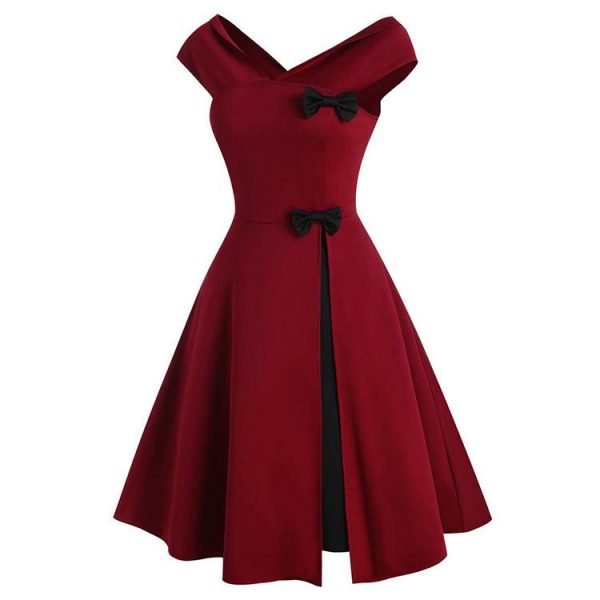 Design: This vintage style dress of two black bowknots. slash collar. and V-neck will look very elegant and noble on you.