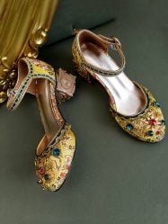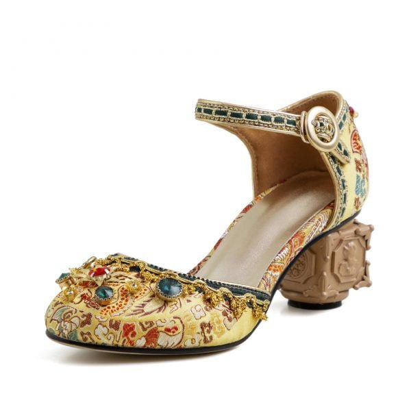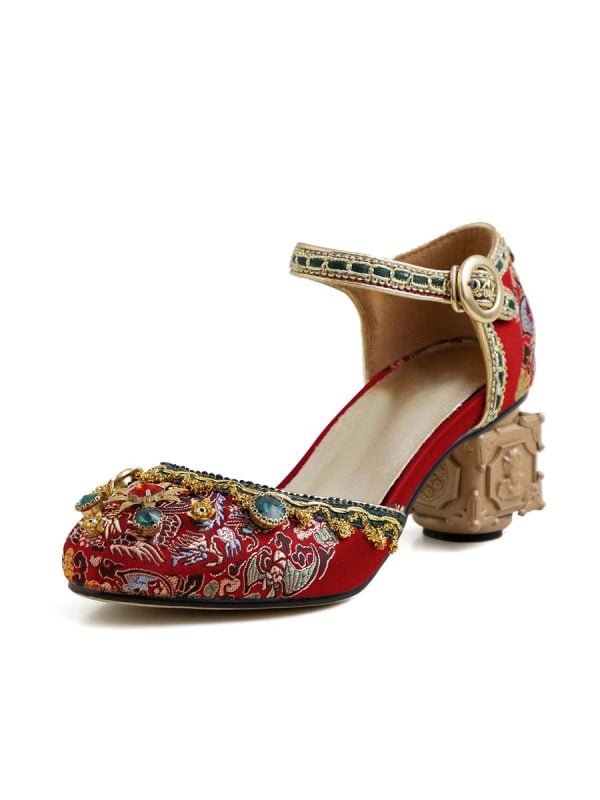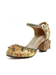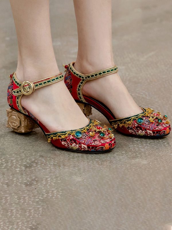 Women’s Sandals Baroque Satin Beaded Round Toe Block Heel Pumps