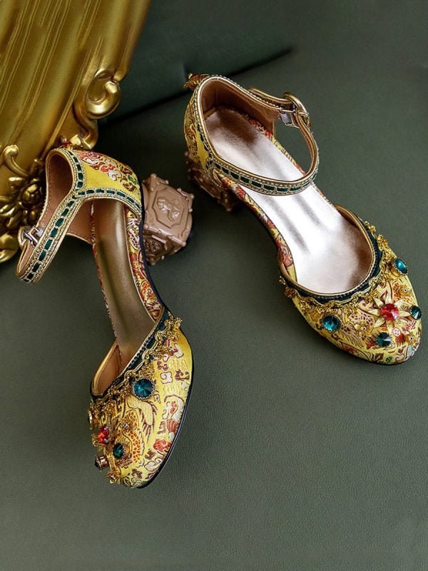 The satin rhinestone decoration and the carved thick heel make this pair of shoes full of retro style and the buckle design is easy to put on and take off;