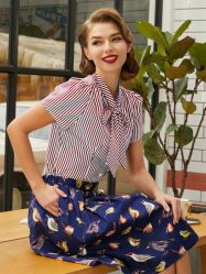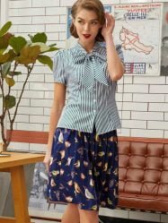 Women’s Shirt Bowknot Decoration Neck Striped Print Short Sleeve Vintage Top