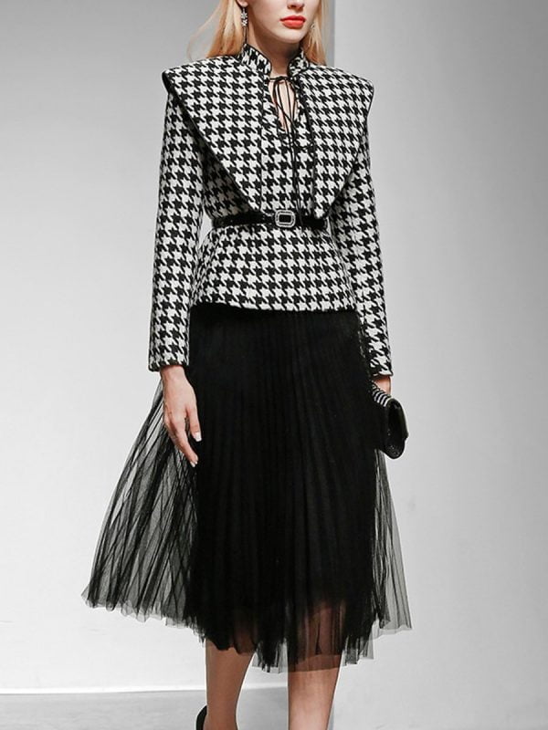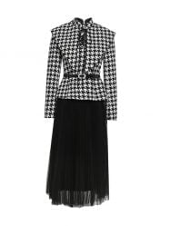 The tie-up collar design has a unique sense of design; Houndstooth printing makes this dress suit no longer monotonous; Mesh skirt fabric is comfortable. light. and elegant;