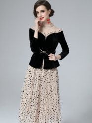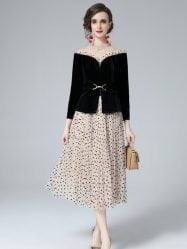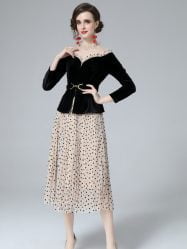 Women’s Skirt Suits Velvet Spliced Top Polka Dot Pleated Two Pieces Dress