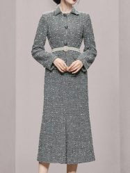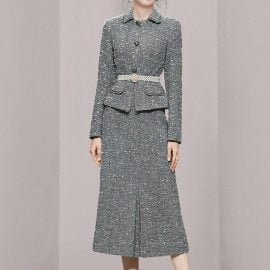 The unique tweed and pearl belt make this skirt more retro; high-quality fabrics are warm and comfortable; The classic slit skirts perfectly show your figure;