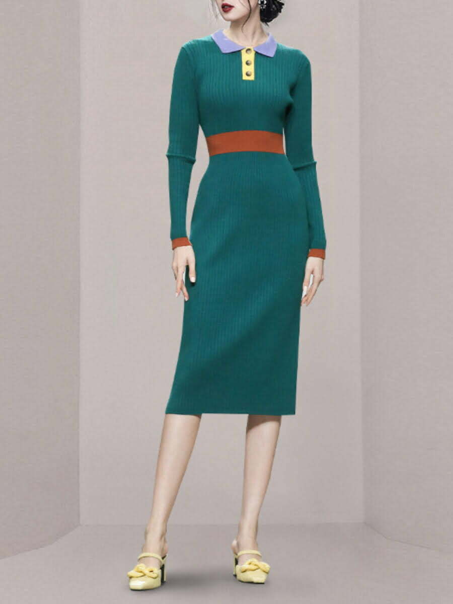 Women’s Sweater Dress Lapel Contrast High Waist Long Sleeve Pencil Dress