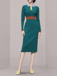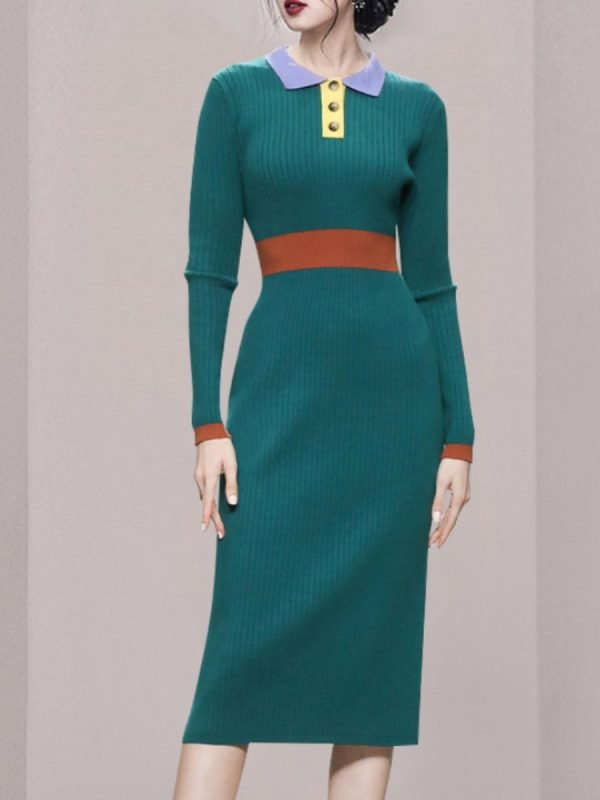 Women’s Sweater Dress Lapel Contrast High Waist Long Sleeve Pencil Dress