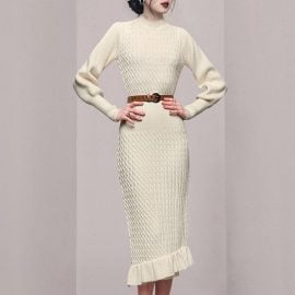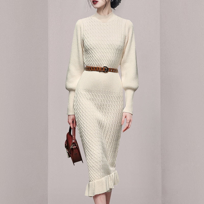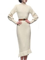 Women’s Sweater Dresses Half High Neck Puff Sleeve Ruffled Knitted Midi Dress