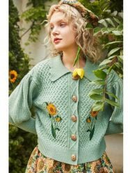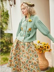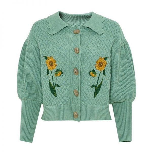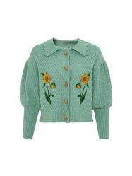 Women’s Sweaters Vintage Lapel Sunflower Embroidery Puff Sleeve Button Cardigans