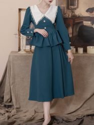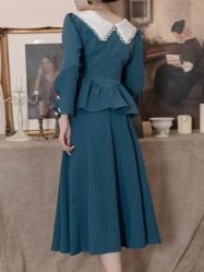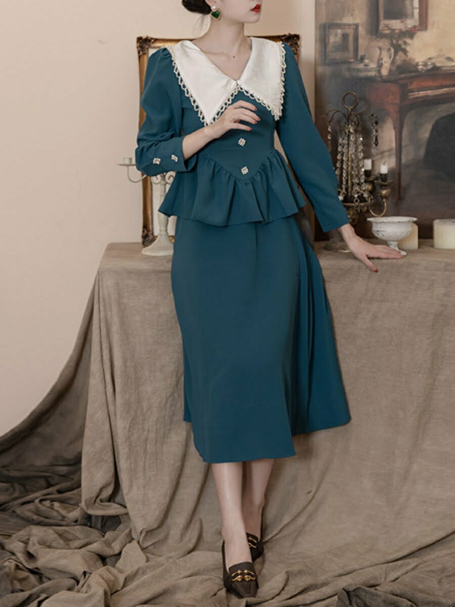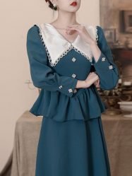 The contrasting color neckline is decorated with pearl lace. which is unique and exquisite; The retro turquoise blue paired with a classic skirt suit will bring you back to the 1950s;