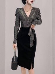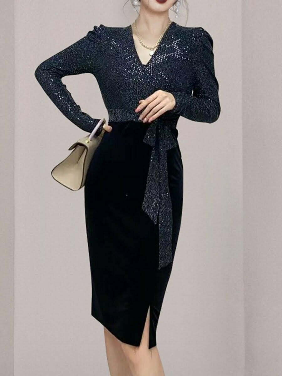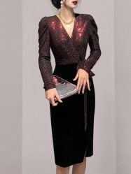 Women’s Velvet Dresses V-neck Sequin Belt Long Sleeve Split Bodycon Dress
