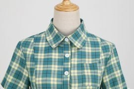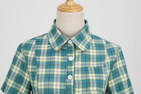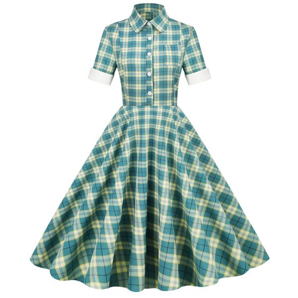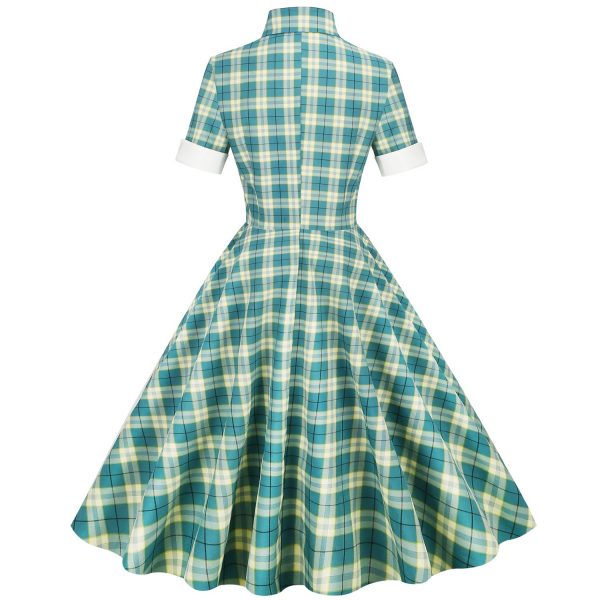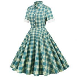 Women’s Vintage Dress Lapel Single Breasted Short Sleeve Plaid Dress