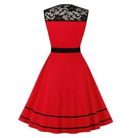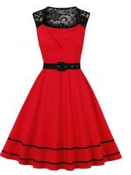 Women’s Vintage Dresses Sleeveless Floral Lace Patchwork Belt Swing Dresses