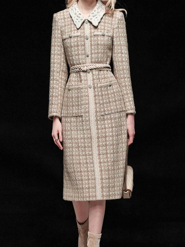 The lace stitching neckline and houndstooth print are matched to make this dress unique and fashionable; The exquisite single-breasted decoration on the front makes this dress look elegant and luxurious;