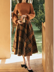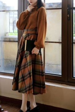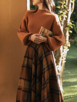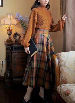 Women’s Winter Dress Loose Knitted Sweater With Plaid Skirt Two-Piece Suit